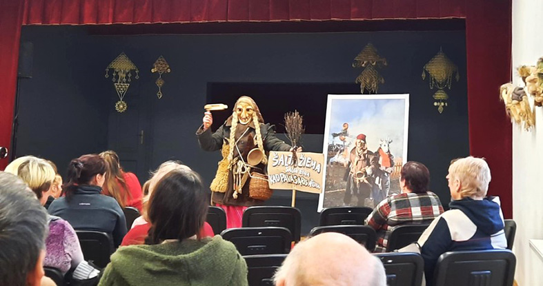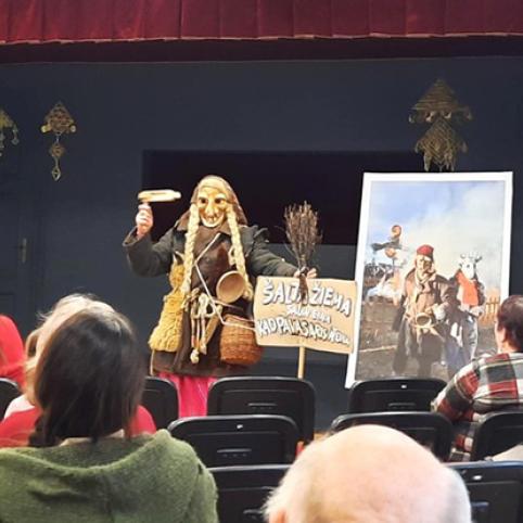 Medžio drožėjas Eugenijus Arbušauskas renginio dalyviams papasakojo apie Užgavėnių šventimo tradicijas ir kaukių kūrybą.