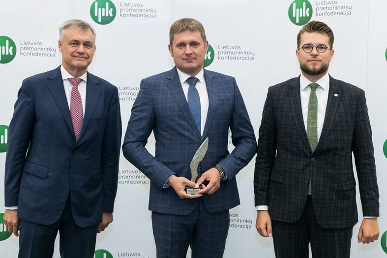 AB „Dolomitas“ generaliniam direktoriui Mindaugui Gudui (viduryje) Lietuvos pramonininkų konfederacijos suvažiavime įteikta nominacija „Lietuvos metų eksportuotojas – 2019“.