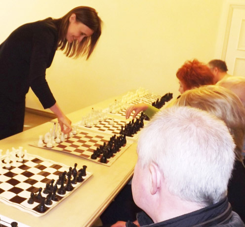 SIMULTANAS: Bene įdomiausias varžybų etapas – simultanas su didmeistre Viktorija Čmilytė–Nielsen, kuriame dalyvavo 16 šachmatininkų.